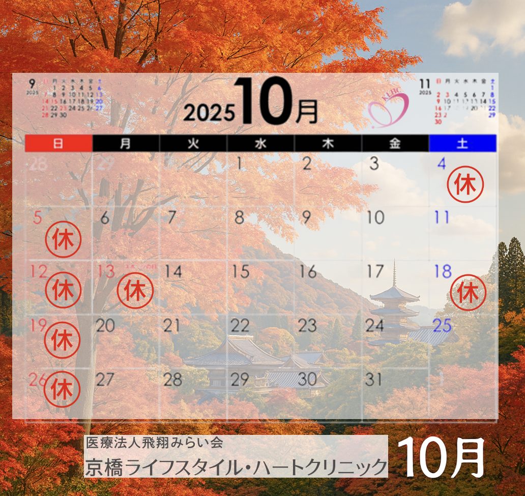 - 10月の休診日のお知らせ。 朝夕の風に秋の気配を感じる季節となりました。皆さまにおかれましては、お健やかにお過ごしでしょうか。 秋は気温の変化が大きく、夏の疲れが出やすい時期です。体調を崩しやすく、血圧の変動や心臓・呼吸器の症状が出やすくなりますので、どうぞご自愛ください。当院では、引き続き生活習慣病や心臓・血管の健康管理に加え、季節の変わり目の不調や予防にも力を入れてまいります。定期的な検診や体調のご相談など、お気軽にお立ち寄りください。