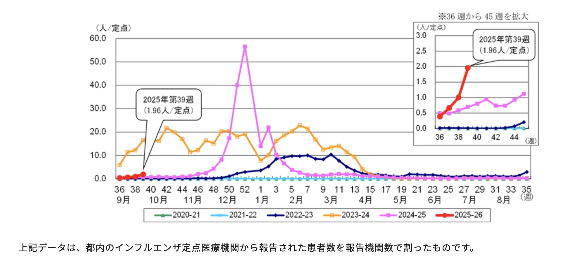 インフルエンザ流行期にすでに突入しています!! 報道発表資料 2025年10月2日 保健医療局 インフルエンザの流行シーズンに入りました 咳エチケットなど、感染予防の徹底を インフルエンザは、流行時期に合わせ、毎年、第36週から翌年の第35週までの1年間をインフルエンザシーズンとして発生動向を調査しており、2025-2026年シーズンは、2025年9月1日が起点となります。 第39週(9月22日から9月28日まで)の都内定点医療機関からの患者報告数は1.96と、流行開始の目安となる定点当たり1.0人を超え、昨年よりも1か月以上早く、都においてもインフルエンザが流行シーズンに入りました。 今後、本格的な流行が予想されるため、インフルエンザにかからない、感染を広げないために、こまめな手洗い、消毒、咳エチケット等の基本的な感染防止対策を一人ひとりが心がけてください。 東京都庁総合ホームページより抜粋 本年は、例年より早く流行に入っていますので、 こまめな手洗い、消毒 着用が効果的な場面でのマスク着用 休養、栄養・水分補給 咳エチケット 適度な室内加湿・換気 上記を心がけましょう。 また、当院では、ワクチン接種もすでに開始しております。 →可能な限りHPからのワクチン予防接種枠で予約をお願いいたします。お知らせ